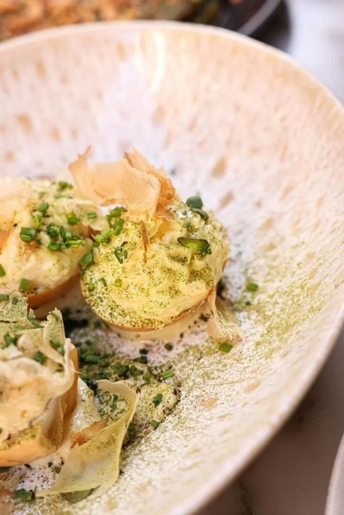 L'œuf "Secci Mayo" : Oubliez l'œuf mayonnaise de bistrot. Ici, il est twisté avec des pickles d'oignons rouges, de la cacahuète croquante et la vivacité du galanga.